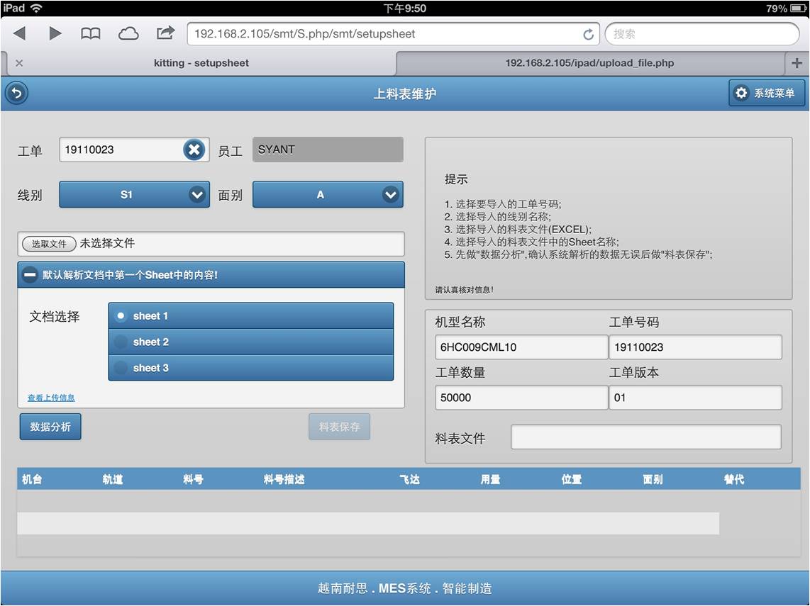 在选择了料表文件后,系统会分析文档里的sheet并显示在界面上,用户可以自助选择要导入哪个Sheet的内容。选定后系统会自动抓取文档中数据并保存。