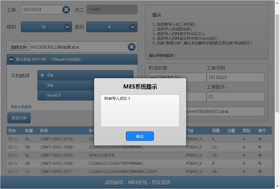 注意,每个工单、每条线,只会有一份料表,如果投入新料表后。之前已经导入过的料表将会失效。