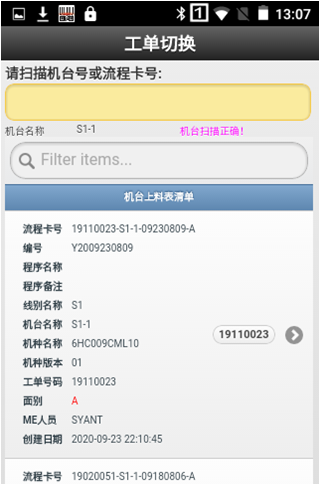 用户扫入机台编号,PDA会显示该机台上的所有可用料表。如果料表清单很多,用户可以在搜索框里输入要生产的工单,PDA会过滤出这个工单的料表信息。