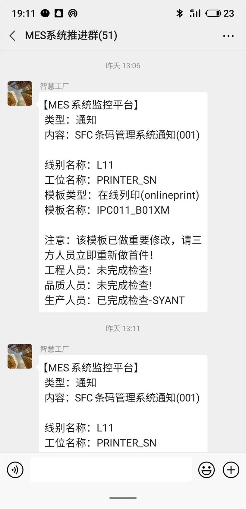 同时,MES系统会发出微信推送, 提示三个单位的人员立即去现场确认处理。 如下图所示,系统会推送是哪条线,哪个工位,哪个模板被改动,。如红框处所示,必须是工程、生产和品质三家单位对该模板都做了确认后,MES系统才会认为改动后的模板有效,并停止报警。
