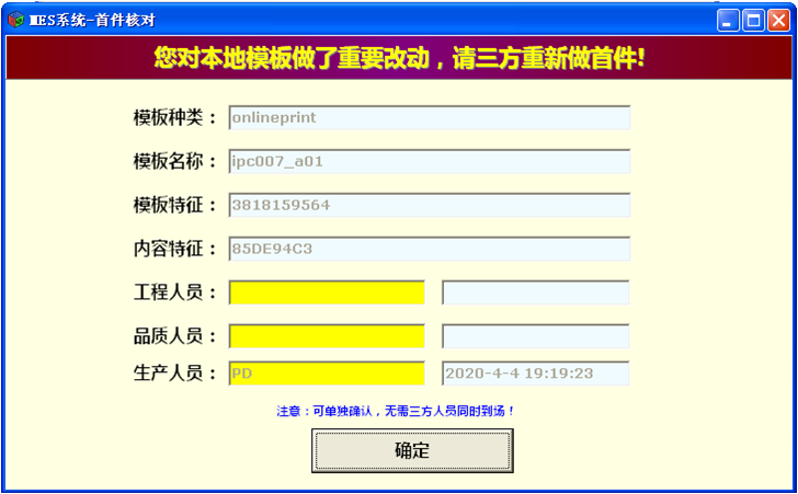 此时,MES系统要求对改动过的模板重新做首件检查。需要工程、生产和品质三家单位的人员做首件检查并确认。