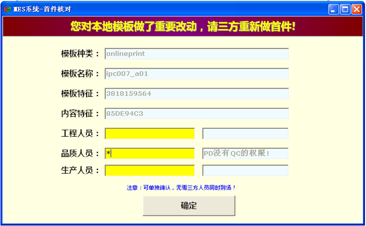 此时,MES系统要求对改动过的模板重新做首件检查。需要工程、生产和品质三家单位的人员做首件检查并确认。