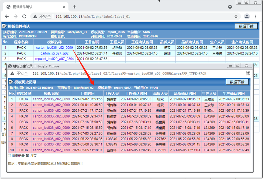 MES系统所有带有列印功能的程序,都多了一个“模板监控”的按钮,如下图红色框线所示。如果系统监控到模板是正确的(有被品质、生产、工程三个单位的人员在MES系统中确认过),则显示“模板正确”,可以正常生产。如果系统监控模板无效,则显示“首件确认”的红色文字。
