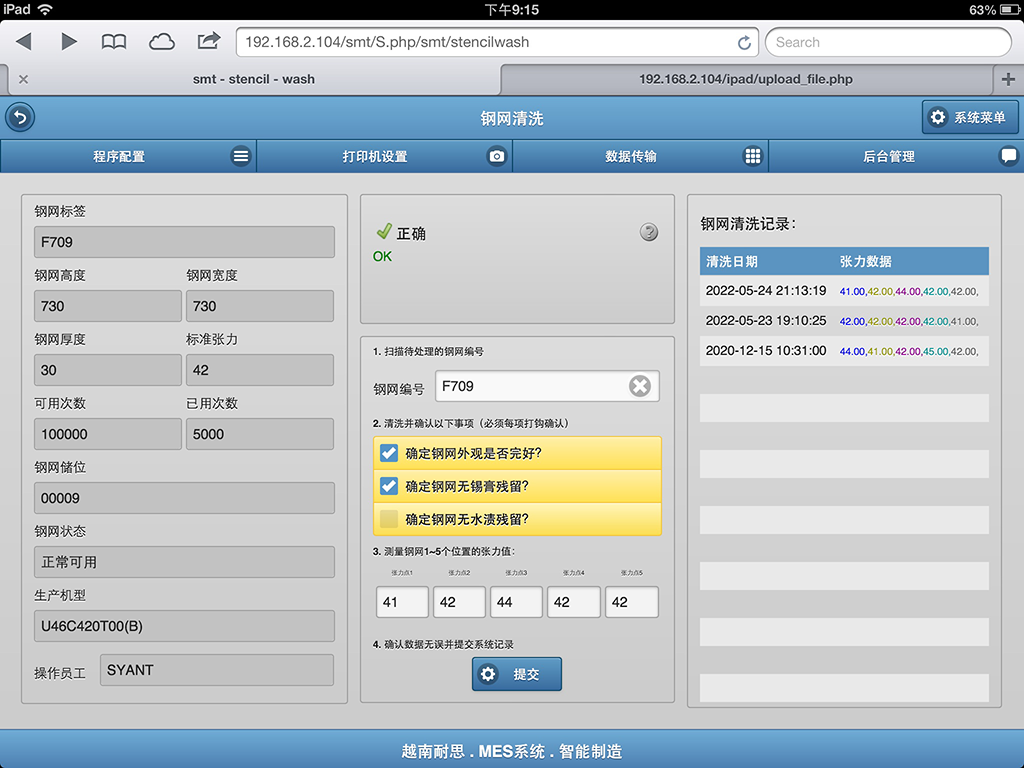 用于查询钢网的清洗记录,包括张力测试数据。