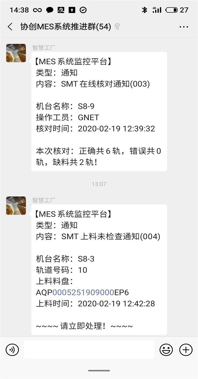 看板上的“注意”信息一定要及时处理,如果在规定时间内未处理,则MES系统后台会触发微信推送,相关主管装收到异常提示: