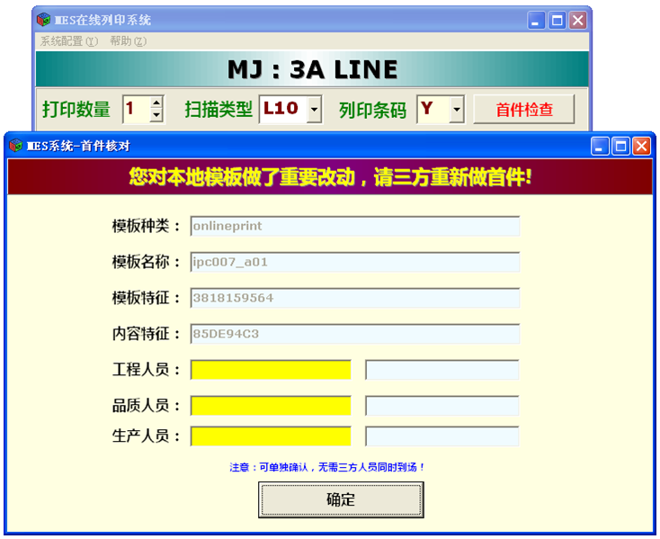 此时,MES系统要求对改动过的模板重新做首件检查。需要工程、生产和品质三家单位的人员做首件检查并确认。